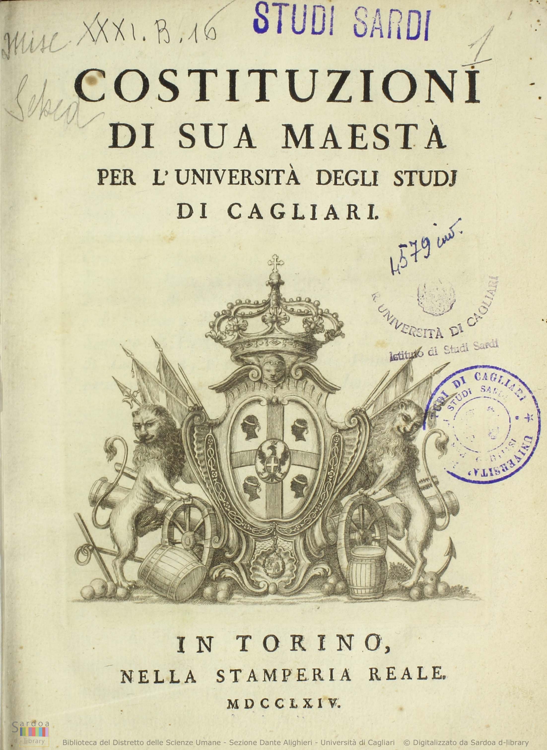 Frontespizio delle Costituzioni di Sua Maestà per l’Università degli Studi di Cagliari,